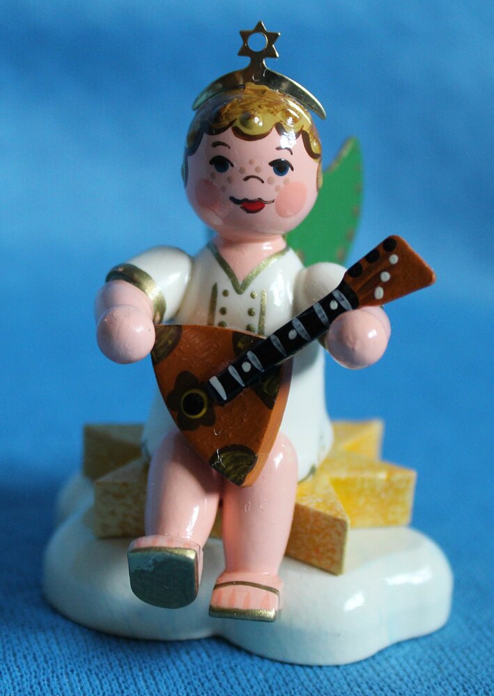 Ausgestattet mit einer Drehleier ist dieser Engel. Zarte Töne, wie bei einem Leierkasten, erklingen aus diesem Instrument. Der Engel ist 6,5 cm groß.